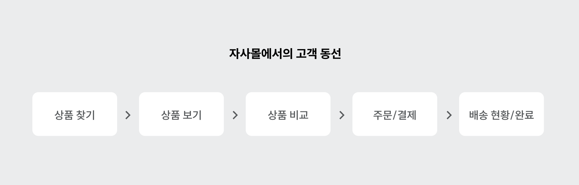 자사몰에서의 고객 동선은 아래와 같이 비교적 간단합니다. 자사몰을 방문한 고객은 이미 브랜드에 대해 충분히 학습된 ‘인지 고객’이기 때문인데요. 따라서 브랜드에 대한 장황한 스토리를 설명하기보다는 실질적으로 구매 결정에 도움이 되는 정보를 제공하는 것이 중요하죠.